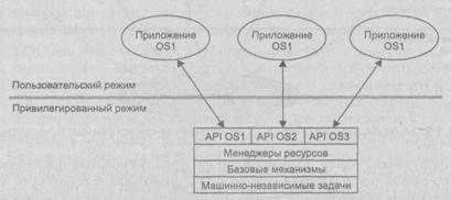 Для этого непосредственно в пространстве ядра системы размещены прикладные программные интерфейсы всех этих ОС: API OS1, API OS2 и API OS3.