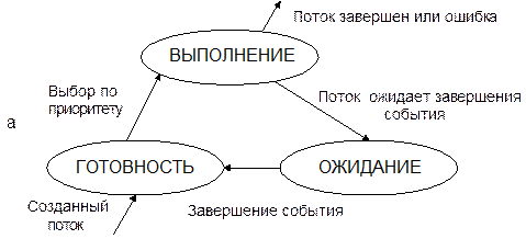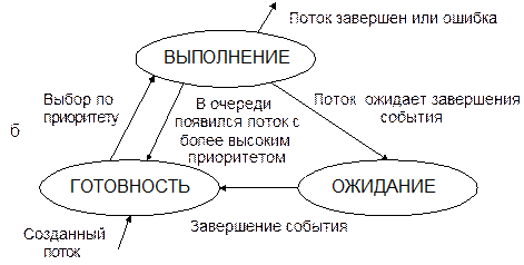 В системах с абсолютными приоритетами выполнение активного потока прерывается кроме указанных выше причин, еще при одном условии: если в очереди готовых потоков появился поток, приоритет которого выше приоритета активного потока. В этом случае прерванный поток переходит в состояние готовности (рисунок 4.6, б).