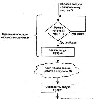 На рисунке 5.3 показан фрагмент алгоритма потока, использующего для реализации взаимного исключения доступа к критическим данным D блокирующую переменную F(D). Если переменная F(D) установлена в 0, то данные заняты и проверка циклически повторяется. Если же данные свободны (F(D) = 1), то значение переменной F(D) устанавливается в 0 и поток входит в критическую секцию. После того как поток выполнит все действия с данными D, значение переменной F(D) снова устанавливается равным 1.