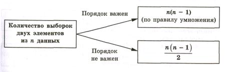 Это рассуждение верно и в общем случае выбора двух элементов из п данных. Оказывается, что всегда количество выборок двух элементов без учета порядка будет ровно в два раза меньше, чем количество выборок с учетом порядка. На рисунке представлена соответствующая схема (рис. 4.8).
