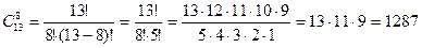 Решение. По условию порядок выбора не важен. Значит, нам требуется найти количество всех выборок 8 элементов из 13 данных без учета порядка, то есть число сочетаний из 13 элементов по 8: