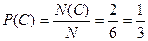 г) Интересующее нас событие С произойдет ровно в двух случаях, когда выпадет число очков 5 или 6. Значит, N(C) = 2 и