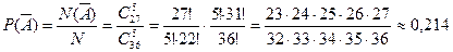 состоит в том, что среди выбранных пяти карт нет ни одной карты бубновой масти. Но это значит, что все 5 карт выбраны из других карточных мастей, т. е. из 36 - 9 = 27 карт. Значит, N(А) =