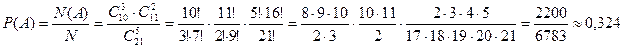 Решение. Шары в урне предполагаем неразличимыми, из 21 шара случайным образом производят выбор 5 шаров, причем порядок выбора не важен. Значит, существует N =