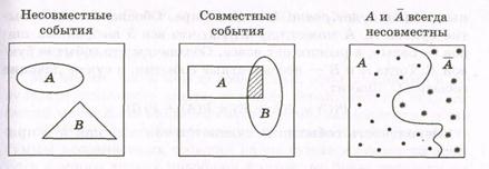Несовместность событий А и В удобно иллюстрировать следующим рисунком (рисунок 5.4). Если все исходы опыта – некоторое множество точек на рисунке, то события А и В – это некоторые подмножества данного множества. Несовместность А и В означает, что эти два подмножества не пересекаются между собой. Типичный пример несовместных событий – любое событие А и противоположное событие А.
