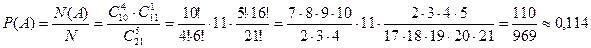 Пример 8. В урне лежат 10 белых и 11 рыжих шаров. Случайным образом достают 5 шаров. Какова вероятность того, что среди этих шаров есть, по крайней мере, 4 белых шара?