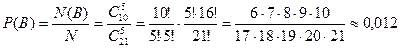 Пример 6. В урне лежат 10 белых и 11 рыжих шаров. Случайным образом достают 5 шаров. Какова вероятность того, что среди этих 5 шаров ровно 3 белых?