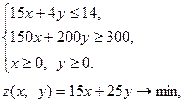 Теперь о стоимости продуктов. Она равна z(х; у) = 15x + 25y и в соответствии с высказанными пожеланиями должна быть минимальной. Последнее записывается так: z(х; у) = 15x + 25y → min.