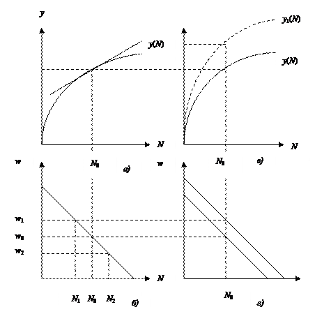 Тангенс угла наклона касательной к графику производственной функции y = y (N) представляет собой предельную производительность труда при соответствующем числе занятых. Чтобы определить объем спроса на труд, нужно на график предельной производительности труда наложить график ставки реальной заработной платы w. Точка их пересечения укажет на количество труда N 0, обеспечивающее максимум прибыли. Зная количество используемого труда, по графику производственной функции можно определить объем выпуска продукции y 0.