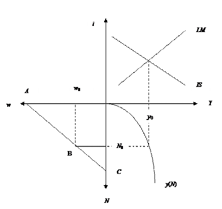 Графиком спроса на труд является не весь график предельной производительности труда (линия АС), а ломаная АВN 0: по мере роста реальной ставки заработной платы от w 0 до А спрос на труд будет сокращаться с N 0 до нуля. Но при ставке ниже w0 спрос на труд сохранится на уровне N 0. Уровень занятости и реальная цена спроса на труд могут изменяться только под воздействием факторов, смещающих линии IS и LM.