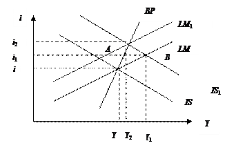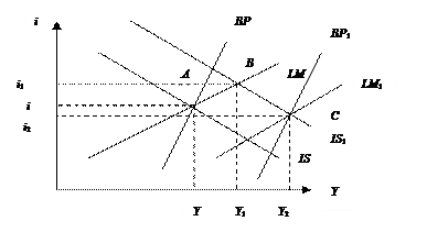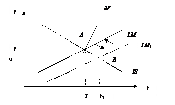 Пусть экономика находится в точке А в состоянии внутреннего и внешнего равновесия. Увеличение предложения денег при стимулирующей денежно-кредитной политике сдвинет кривую LM к LM 1. Экономика переместится в точку В.