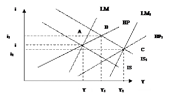 финансовых операций и платежного баланса в целом. Экономика переходит в точку В. В таком состоянии национальная валюта крепнет и Центральный банк для предотвращения роста обменного курса национальной валюты скупает иностранную валюту, увеличивает в обращении массу национальной валюты. Ставка процента падает, платежный баланс и внешнее равновесие выравнивается в точке С при увеличении дохода до Y 1.