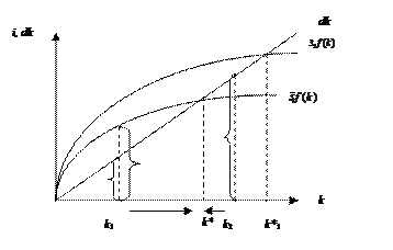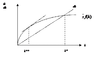 Если запас капитала меньше, чем k **, то необходима программа по повышению уровня сбережений. Эта программа первоначально приведет к росту инвестиций и падению потребления, но, по мере накопления капитала, потребление вновь начинает расти.