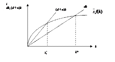 Пусть население растет с темпом n. Теперь для сохранения прежнего уровня капиталовооруженности необходим объем инвестиций, который не только покроет выбытие капитала, но и обеспечит им новых рабочих, т. е. изменение запаса капитала на одного работающего станет равным