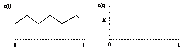 Мгновенное значение ЭДС е(t) (напряжения u(t) или u, тока i(t) или i) - значение ЭДС (напряжения, тока) в данный момент времени. График зависимости мгновенного значения e(t) от времени носит название временной диаграмы (рис.1.2). Постоянный ток (напряжение) ‑ ток (напряжение), который в установленном режиме электрической цепи не зависит от времени. На рис.1.2б приведенна диаграма постоянной ЭДС.