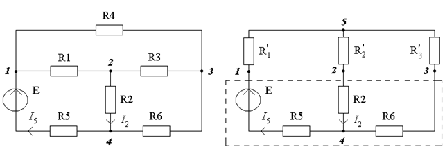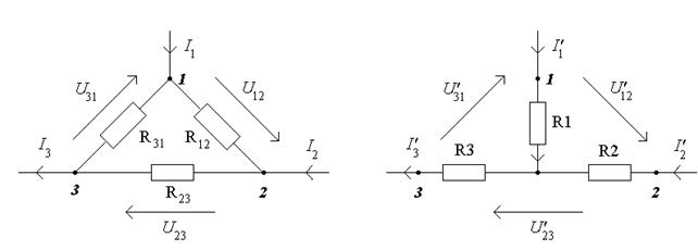 ). Такие соединение иногда создают трудности в расчетах элeктрических цепей, и возникает необходимость преобразования треугольника ребер в эквивалентную ЗВЕЗДУ и наоборот для перехода к цепи со смешанным соединением.