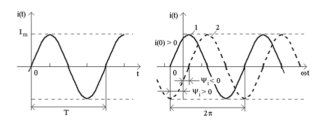 Синусоидный ток (напряжение, ЭДС) -это электрический ток, который есть синусоидной функцией времени. В литературе также применяется название гармонический ток - который изменяется по синусоидным или косинусоидным законам. На рис.7.2 показано временную диаграмму синусоидного тока, мгновенное значение которого определяется по формуле: