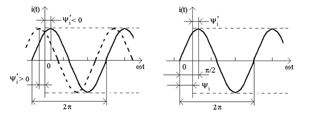 Начальная фаза синусоидного электрического тока – значение фазы синусоидного тока в начальный момент времени (t =0). Иначе, начальная фаза соответствует абсцисссе ближайшей точки перехода с отрицательной полуволны к положительной. На рис.7.2а начальная фаза колебания равняется нулю, на рис.7.2б первая кривая имеет начальную фазу