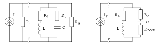 При реальных условиях, когда контур питается реальным генератором, ток I изменяется со сменой напряжения на контуре. Это может существенно повлиять на вид частотных характеристик. В этом случае для исследования выборочных свойств контура следует заменить источник питания эквивалентной схемой с идеальным источником тока (рис.13.6).