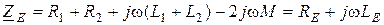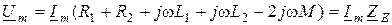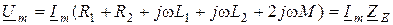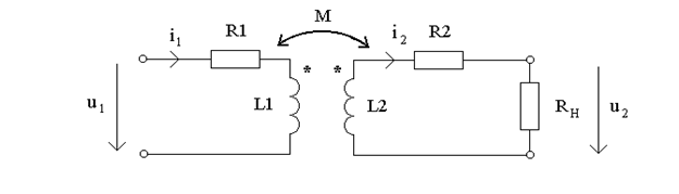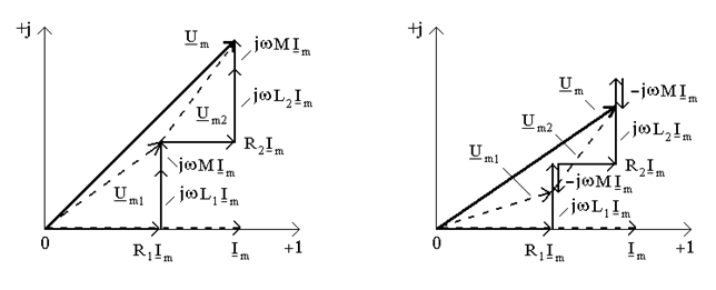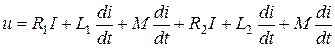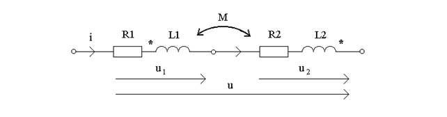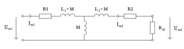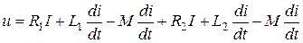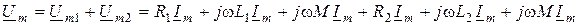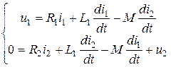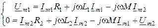 Указанное на схеме направление токов соответствует встречному включению. Итак, из-за отсутствия источника во вторичной обмотке, катушки подключены встречно. Тогда уравнения по второму закону Кирхгофа для первичного и вторичного контуров можно записать в таком виде: