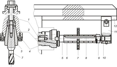 Рис.4.2. Способы крепления фрез: а – хвостовых; б – насадных: 1 – шомпол; 2 – шпиндель; 3 – втулка; 4 – шпонка торцовая; 5 – оправка; 6 – втулка; 7 – инструмент (фрезы); 8 – шпонка осевая; 9 – гайка; 10 – цапфа оправки; 11 – серьга; 12 – хобот