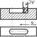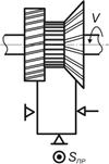 В станине 1 (рис.4.1,б) горизонтально-фрезерного станка размещена коробка скоростей 2 и вмонтирован шпиндель 8, в котором закрепляют режущий инструмент. На горизонтально-фрезерных станках в основном используют насадные фрезы (цилиндрические, дисковые, угловые), которые можно закреплять с помощью центровой оправки, вставляемой в коническое отверстие шпинделя. На направляющей хобота 10 станка монтируют подвески 11, поддерживающие правый консольный конец оправки. Фреза со шпинделем совершает главное вращательное движение. Движение на фрезу передается от шпинделя через шпонку. Заготовку устанавливают в приспособлении, которое закрепляется на столе 7. При небольшом объеме производства в качестве приспособления применяют универсальные машинные тиски, прижимные планки и т.п. В массовом производстве используют специальные приспособления с механизированным приводом.