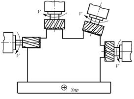 Заготовки закрепляются в приспособлениях на гранях барабана. Станок имеет две пары фрезерных головок, в которых устанавливаются торцовые насадные фрезы со вставными резцами. Фрезы, установленные в верхних фрезерных головках, осуществляют черновую обработку поверхностей, а в нижних – чистовую. На барабанно-фрезерных станках обрабатываются довольно крупные заготовки, станки такого типа широко применяют, например, в автотракторной промышленности.