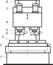 На станине 1 карусельно - фрезерного станка смонтирована стойка 8 с вертикальными направляющими, по которым перемещается и закрепляется на необходимой высоте фрезерная головка 6 с двумя шпинделями 5. Поскольку на станках такого типа чаще всего обрабатывают горизонтальные плоскости, то в качестве режущего инструмента используют преимущественно торцовые насадные фрезы 4, которые закрепляют в шпинделях. Станок имеет круглый вращающийся стол 2. Стол смонтирован на салазках, поэтому при настройке станка он вместе с ними может перемещаться вдоль поперечных направляющих станины. В рабочем состоянии стол медленно и непрерывно вращается вокруг вертикальной оси. На столе равномерно по окружности располагаются приспособления 3. Обработка на карусельно-фрезерном станке происходит без остановки станка при непрерывном вращении стола. Заготовки устанавливают в приспособления и снимают на ходу, когда они находятся в загрузочной позиции. Стол, вращаясь, транспортирует заготовку в рабочую зону, где она последовательно проходит черновую и чистовую стадии обработки инструментами, установленными в двух шпинделях фрезерной головки и настроенными на получение определенного размера (предварительно и окончательного) обрабатываемой поверхности. Пройдя полный круг, заготовка вновь попадает в загрузочную зону, где ее снимают с приспособления, и на ее место устанавливают следующую.
