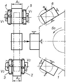 На барабанно-фрезерных станках фрезеруют в основном вертикальные плоскости заготовок. Обработка производится в два этапа – предварительная и окончательная. Движение подачи заготовки при этом, как и на карусельно-фрезерном станке, также является вращательным и осуществляется за счет непрерывного вращения стола (барабана), но ось вращения расположена горизонтально (рис.4.6).
