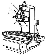 Согласно рисунку, по горизонтальным направляющим станины 5 в поперечном направлении перемещаются салазки. По направляющим салазок движется стол, имеющий поворотную часть. По вертикальным направляющим стойки перемещается шпиндельная бабка 2 со шпинделем.