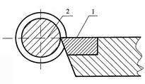 Треугольную резьбу можно нарезать на токарно-винторезных станках резьбовыми резцами, т.е. резцами, заточёнными под требуемым профильным углом (60º или 55º). Получение профиля резьбы обеспечивается соответствующим профилем резца и правильной его установкой относительно оси заготовки. Передняя плоскость 1 резьбового резца должна располагаться в осевой плоскости 2 нарезаемой резьбы (рис.6.2).