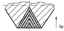 Величина продольной подачи такова, чтобы за один оборот заготовки резец переместился точно на один шаг резьбы. Так как за открытое перемещение резца вдоль оси заготовки нарезать резьбу полностью не представляется возможным из-за её значительной глубины и больших нагрузок на вершину резца, то после радиального отвода резца и возвращения в исходное положение следует определённое радиальное врезание (радиальная подача) и цикл перемещений повторяется. Удаление металла из впадины резьбы осуществляется постепенно, отдельными слоями и может быть представлено схемой вырезания (рис.6.4).
