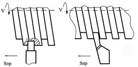 В случае использования двухрезцовой схемы (рис.6.10,а) первый резец, прорезав впадину, окончательно обрабатывает правую её сторону, а второй резец, вводимый в работу после использования первого, формирует левую сторону впадины резьбы. При работе по трехрезцовой схеме (рис.6.10,б) первый резец предварительно прорезает прямоугольную впадину на полную глубину, а затем два резца поочерёдно обрабатывают противоположные боковые поверхности витка резьбы.