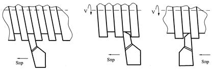 Прямоугольную резьбу можно нарезать по следующим схемам (рис.6.10), характеризуемым радиальной обработкой левой и правой боковых сторон винта, которая необходима для обеспечения требуемой точности впадины.