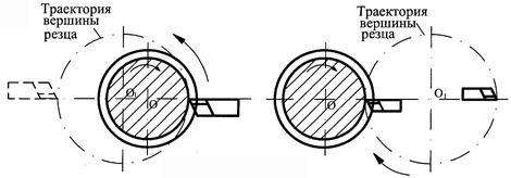 Повышение производительности обработки достигается при нарезании резьб вращающимися резцами (вихревой метод) за счёт увеличения скоростей резания. Заготовка закрепляется в центрах токарно-винторезного станка или в патроне. В процессе работы она медленно вращается. В специальной головке, установленной на суппорте станка, закрепляется резец, имеющий вращательное движение (движение резания) от специального привода. Головка расположена эксцентрично относительно оси заготовки О (рис.6.11).