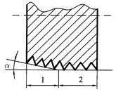 Возможно шлифование длинной резьбы многониточным кругом с продольной подачей заготовки. Оно обеспечивает сокращение проходов по сравнению с однониточным кругом и повышение производительности обработки. Все витки заготовки последовательно шлифуются всеми нитками шлифовального круга. Кинематика шлифования такая же, как и для однониточного круга. Круг заправляется с заходной частью 1, располагаемой под углом α к калибрующей части 2 (рис.6.15).