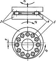 Плоские поверхности можно притирать также вручную или на специальных доводочных станках (рис.7.10, в). Заготовки 4 располагают между двумя чугунными дисками 3 в окнах сепаратора 5. Диски-притиры имеют плоские торцовые поверхности и вращаются в противоположных направлениях и с разными частотами вращения. Сепаратор относительно дисков расположен эксцентрично на величину е. Поэтому при вращении дисков притираемые детали совершают сложные движения со скольжением, и металл снимается одновременно с их параллельных торцов. Станок можно использовать и для доводки коротких цилиндрических деталей с отверстиями, с помощью которых они ориентируются в сепараторе.