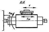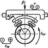 Схема суперфинишной обработки наружной цилиндрической поверхности приведена на рис.7.12, а. Плотная сетка микронеровностей создается сочетанием трех движений: вращательного Sкp заготовки, возвратно-поступательного Sпp и колебательного брусков со скоростью V. Амплитуда колебаний брусков составляет 1,5...6 мм, а частота 400...1200 колебаний в минуту. Движение Sпp ускоряет процесс съема металла и улучшает однородность поверхности. Бруски, будучи подпружиненными, самоустанавливаются по обрабатываемой поверхности. Соотношение скоростей Sкp и V в начале обработки составляет 2...4, в конце 8...16. Процесс характеризуется сравнительно малыми скоростями резания (5...7 м/мин).