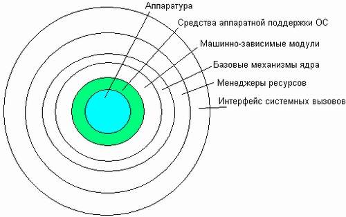 Базовые механизмы ядра. Этот слой выполняет наиболее примитивные операции ядра, такие как программное переключение контекстов процессов, диспетчеризацию прерываний, перемещение страниц из памяти на диск и обратно и т. п. Модули данного слоя не принимают решений о распределении ресурсов — они только отрабатывают принятые «наверху» решения, что и дает повод называть их исполнительными механизмами для модулей верхних слоев. Например, решение о том, что в данный момент нужно прервать выполнение текущего процесса А и начать выполнение процесса В, принимается менеджером процессов на вышележащем слое, а слою базовых механизмов передается только директива о том, что нужно выполнить переключение с контекста текущего процесса на контекст процесса В.
