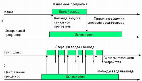 Такое совмещение может достигаться разными способами. Один из них характерен для компьютеров, имеющих специализированный процессор ввода-вывода. В компьютерах класса мэйнфреймов такие процессоры называют каналами. Обычно канал имеет систему команд, отличающуюся от системы команд центрального процессора. Эти команды специально предназначены для управления внешними устройствами, например «проверить состояние устройства», «установить магнитную головку», «установить начало листа», «напечатать строку». Канальные программы могут храниться в той же оперативной памяти, что и программы центрального процессора. В системе команд центрального процессора предусматривается специальная инструкция, с помощью которой каналу передаются параметры и указания на то, какую программу ввода-вывода он должен выполнить. Начиная с этого момента центральный процессор и канал могут работать параллельно (рис. 4.1, а).