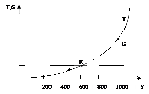 Наклон ломаной кривой Т на каждом из ее участков зависит от ставки налога (t). Равенство расходов и доходов государственного бюджета наблюдается в точке Е. Налоговые поступления при каждом уровне дохода определяются по формуле: Yt = T. Например, если доход (Y) составляет 500 млрд. руб., то при налоговой ставке 0,2 (20%) налоговые поступления составят 100 млрд. руб. При более высоком уровне дохода повышается и налоговая савка, и кривая Т становится более крутой. Наоборот, при снижении дохода величина t уменьшается и кривая Т принимает более пологий вид.