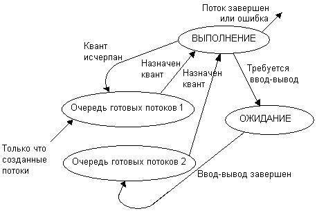Поток, который исчерпал свой квант, переводится в состояние готовности и ожидает, когда ему будет предоставлен новый квант процессорного времени, а на выполнение в соответствии с определенным правилом выбирается новый поток из очереди готовых. Граф состояний потока, изображенный на рис. 4.6, соответствует алгоритму планирования, основанному на квантовании.