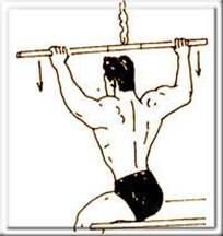 Развернувшись спиной к снаряду, возьмитесь за брусья, обопритесь на них, подвесив себя на локтях; прямые ноги вытяните вниз. На выдохе чуть согнутые ноги подтянуть коленями к груди и задержать как можно дольше. Опускание ног в исходное положение происходит на выдохе.