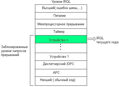 Если же запрос имеет более высокий приоритет, чем IRQL текущего кода, то текущий обработчик прерываний вытесняется и ставится в очередь, соответствующую его значению IRQL, а управление передается новому обработчику в соответствии с IRQL запроса. После этого уровень IRQL процессора делается равным уровню IRQL принятого на выполнение запроса.