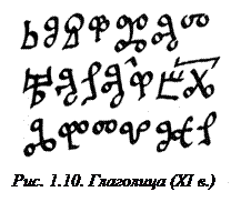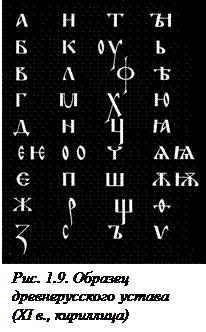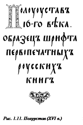 Старославянская письменность известна с X в. в двух различных начертаниях: глаголицы и кириллицы (рис. 1.9, 1.10). Вначале оба начертания существовали параллельно, но со временем за основу русской письменности была взята кириллица. Древнейшие русские рукописи XI в. были написаны кириллицей, почерком, который получил наименование устава. Одним из лучших образцов уставного письма является «Остромирово Евангелие». Позже устав сменился полууставным письмом (рис. 1.11). Преимущество полуустава состояло в скорости написания текста. Уставы и полууставы выполнялись по строго определенному правилу — уставу, от которого и произошло их название. Постепенно появляется скорописный шрифт — скоропись, которая использовалась при переписке книг, составлении деловых бумаг, актов и т. п.