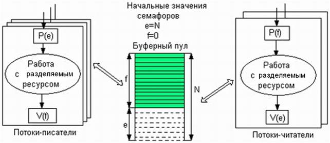 Рассмотрим использование семафоров на классическом примере взаимодействия двух выполняющихся в режиме мультипрограммирования потоков, один из которых пишет данные в буферный пул, а другой считывает их из буферного пула. Пусть буферный пул состоит из N буферов, каждый из которых может содержать одну запись. В общем случае поток-писатель и поток-читатель могут иметь различные скорости и обращаться к буферному пулу с переменой интенсивностью. В один период скорость записи может превышать скорость чтения, в другой — наоборот. Для правильной совместной работы поток-писатель должен приостанавливаться, когда все буферы оказываются занятыми, и активизироваться при освобождении хотя бы одного буфера. Напротив, поток-читатель должен приостанавливаться, когда все буферы пусты, и активизироваться при появлении хотя бы одной записи.
