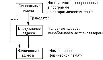 Для идентификации переменных и команд на разных этапах жизненного цикла программы используются символьные имена (метки), виртуальные адреса и физические адреса (рис. 5.1).