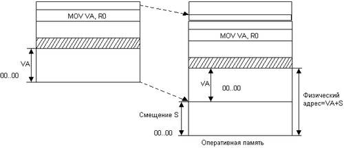 Второй способ заключается в том, что программа загружается в память в неизмененном виде в виртуальных адресах, то есть операнды инструкций и адреса переходов имеют те значения, которые выработал транслятор. В наиболее простом случае, когда виртуальная и физическая память процесса представляют собой единые непрерывные области адресов, операционная система выполняет преобразование виртуальных адресов в физические по следующей схеме. При загрузке операционная система фиксирует смещение действительного расположения программного кода относительно виртуального адресного пространства. Во время выполнения программы при каждом обращении к оперативной памяти выполняется преобразование виртуального адреса в физический. Схема такого преобразования показана на рис. 5.4. Пусть, например, операционная система использует линейно-структурированное виртуальное адресное пространство и пусть некоторая программа, работающая под управлением этой ОС, загружена в физическую память начиная с физического адреса S. ОС запоминает значение начального смещения S и во время выполнения программы помещает его в специальный регистр процессора. При обращении к памяти виртуальные адреса данной программы преобразуются в физические путем прибавления к ним смещения S. Например, при выполнении инструкции MOV пересылки данных, находящихся по адресу VA, виртуальный адрес VA заменяется физическим адресом VA+S.