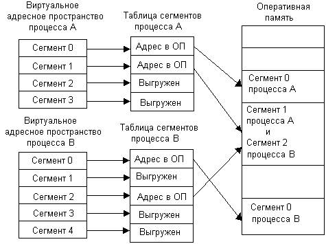 Если виртуальные адресные пространства нескольких процессов включают один и тот же сегмент, то в таблицах сегментов этих процессов делаются ссылки на один и тот же участок оперативной памяти, в который данный сегмент загружается в единственном экземпляре.
