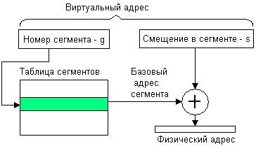 Механизмы преобразования адресов этих двух способов управления памятью тоже весьма схожи, однако в них имеются и существенные отличия, которые являются следствием того, что сегменты в отличие от страниц имеют произвольный размер. Виртуальный адрес при сегментной организации памяти может быть представлен парой (g, s), где g — номер сегмента, a s — смещение в сегменте. Физический адрес получается путем сложения базового адреса сегмента, который определяется по номеру сегмента g из таблицы сегментов и смещения s (рис. 5.19).